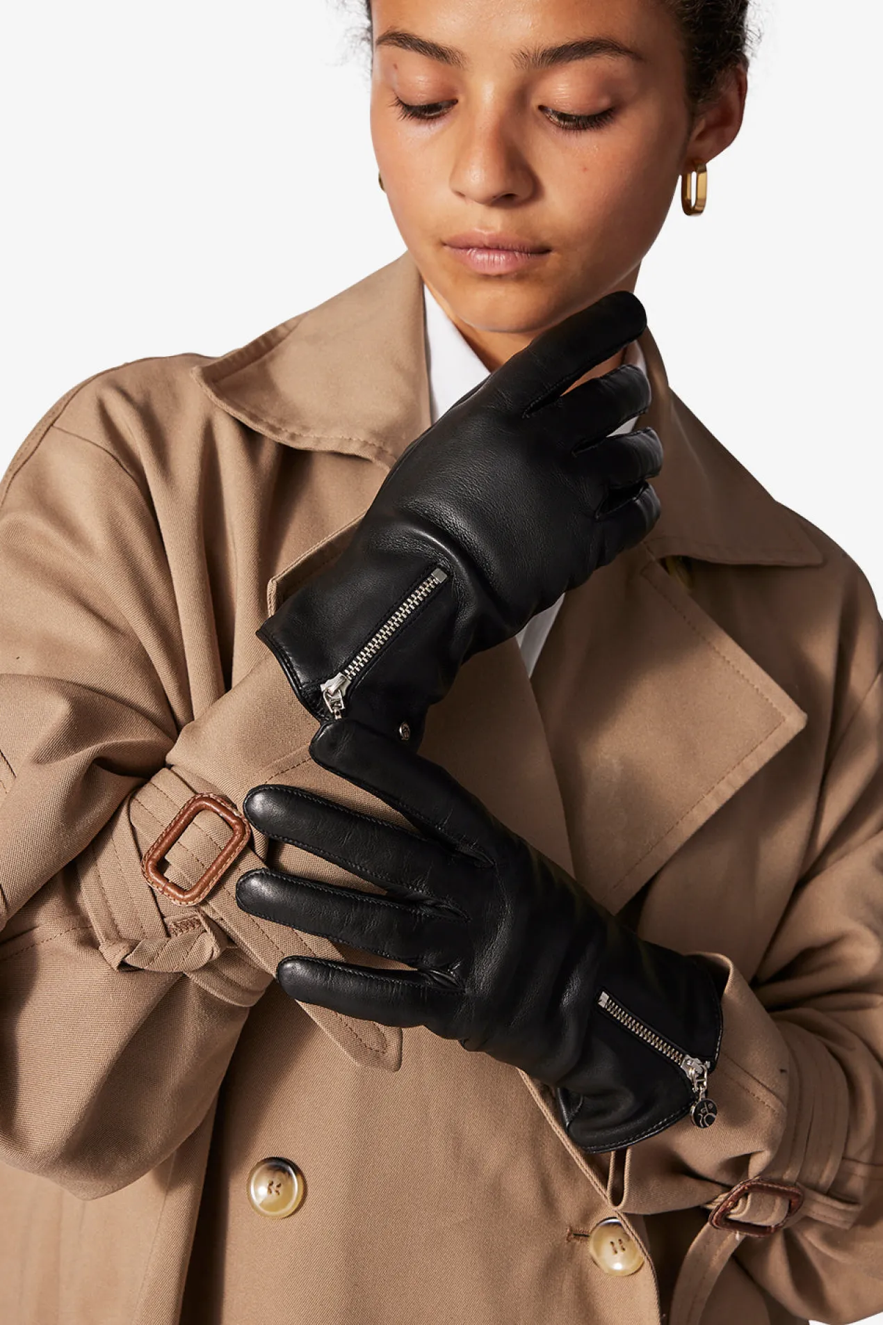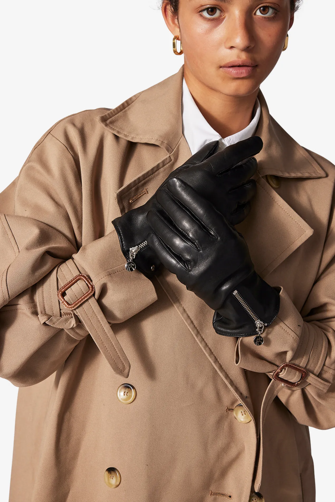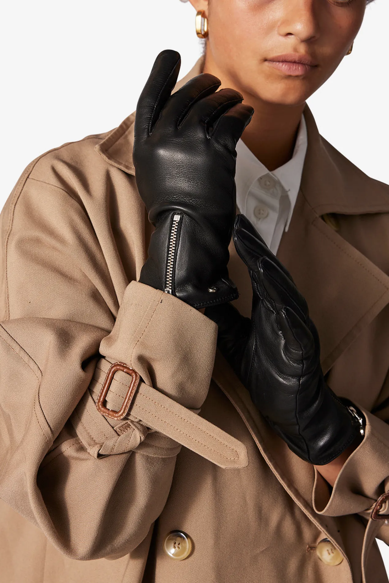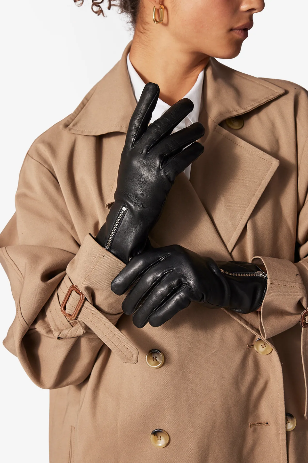 Adax glove Sanne. Nice plain glove in smooth leather with zipper detail on the upper side of the glove. Warm lining in 85% wool and 15% cashmere. There is a touch function in the index finger and thumb on both the right and left glove.