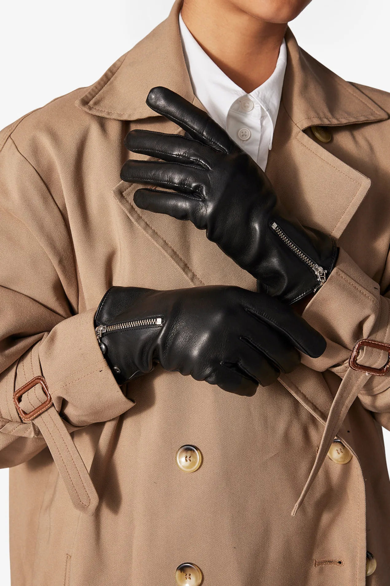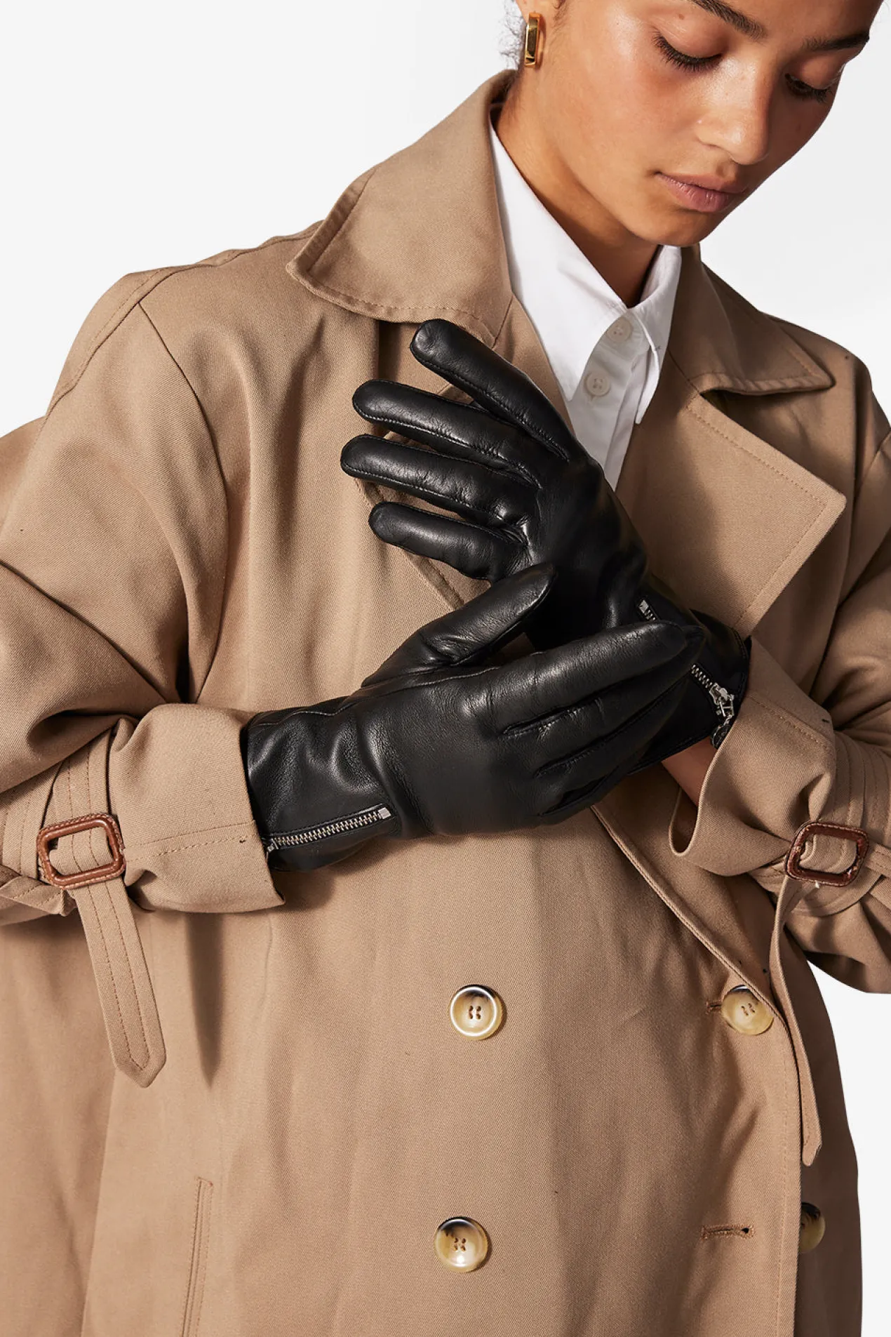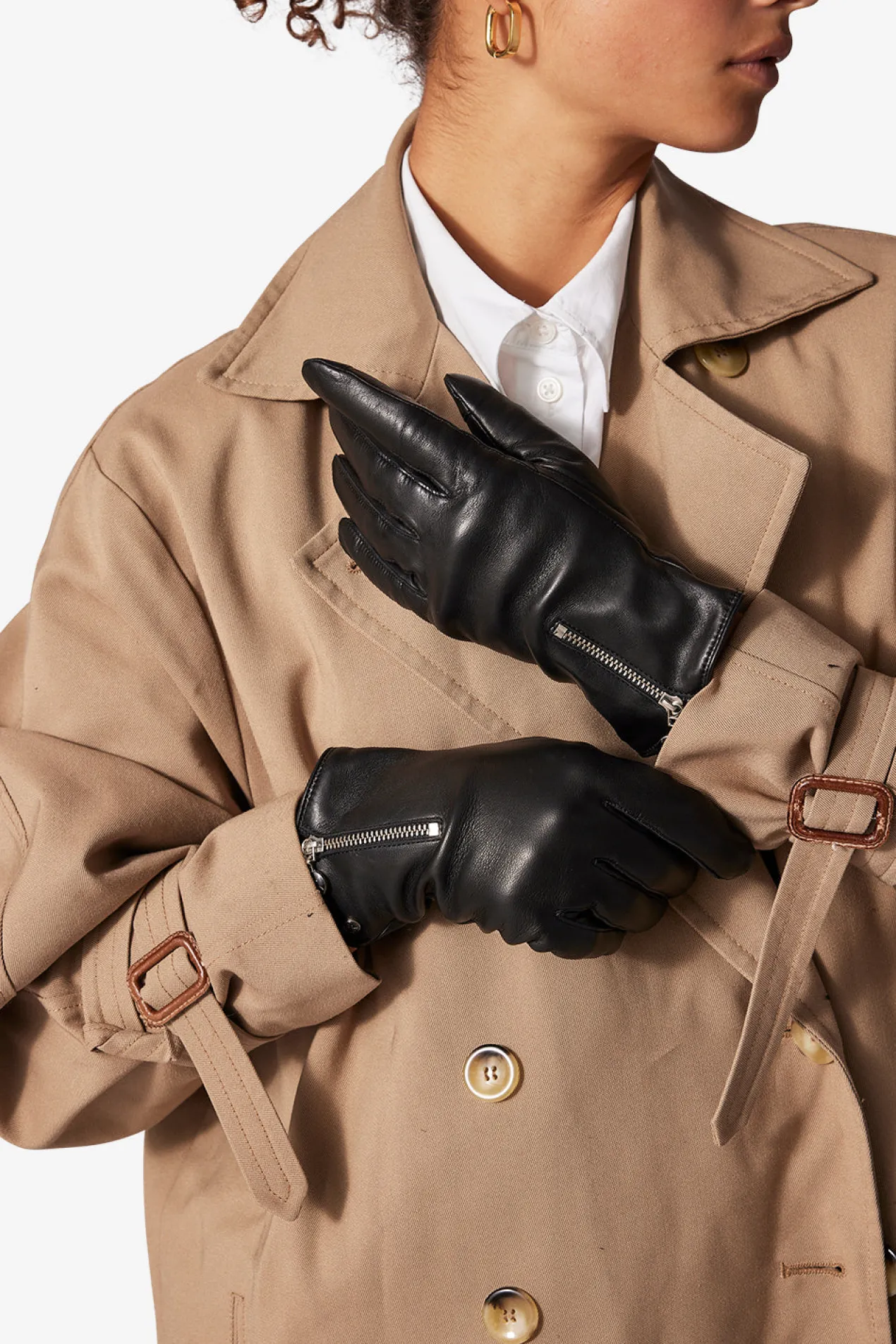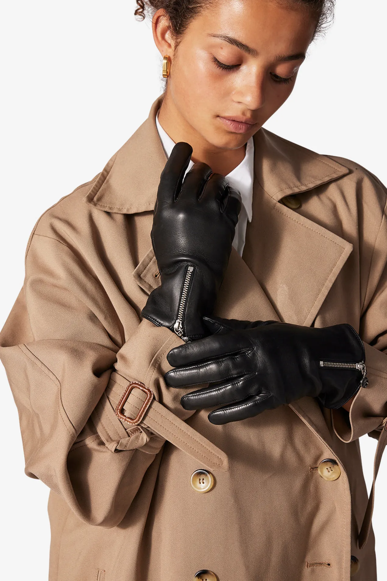 Adax glove Sanne. Nice plain glove in smooth leather with zipper detail on the upper side of the glove. Warm lining in 85% wool and 15% cashmere. There is a touch function in the index finger and thumb on both the right and left glove.