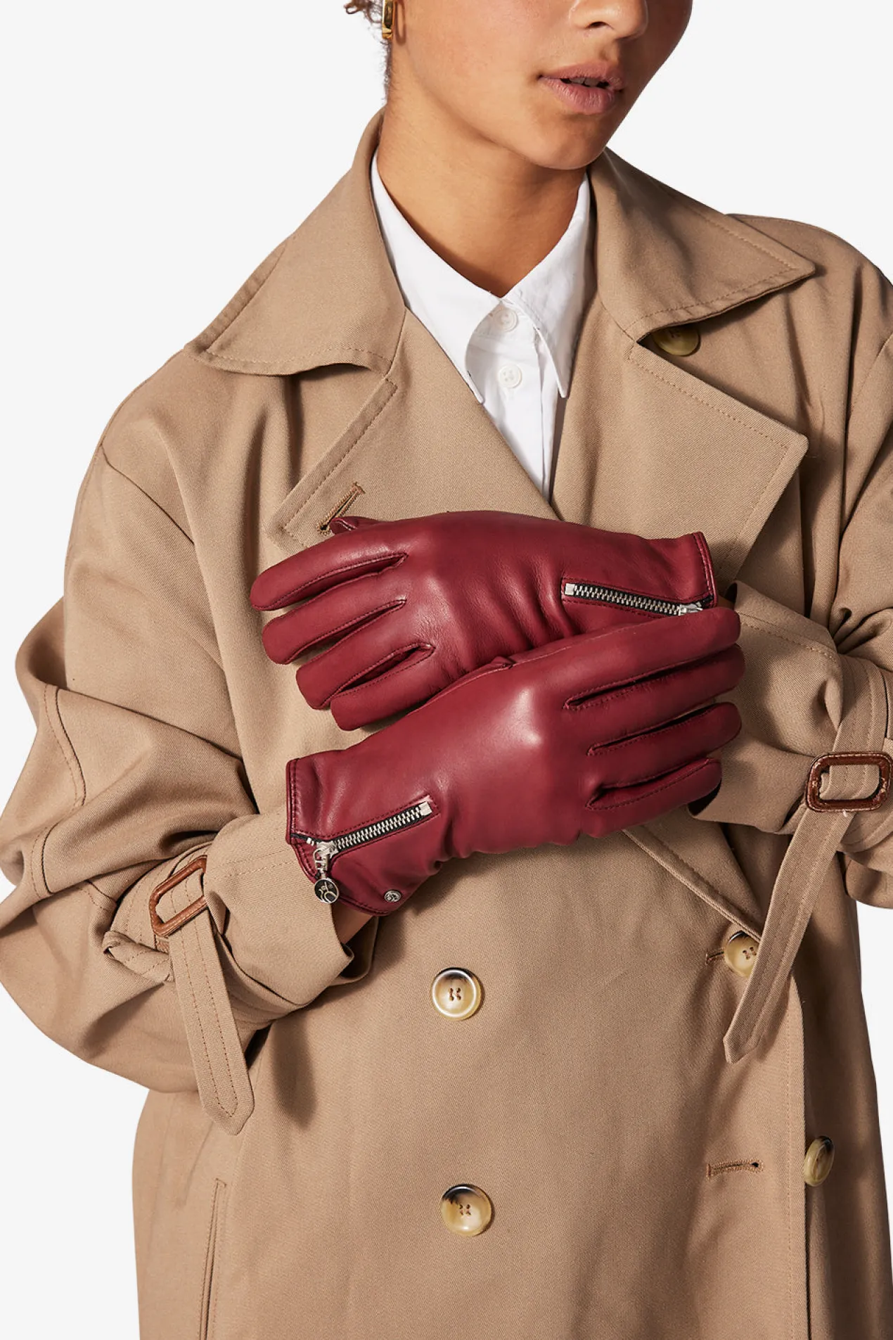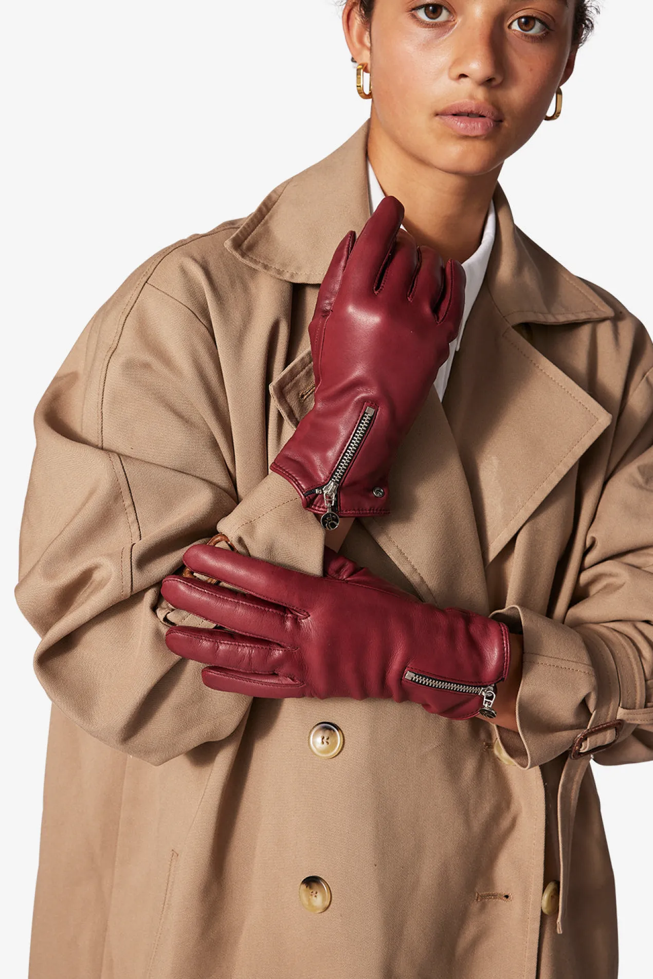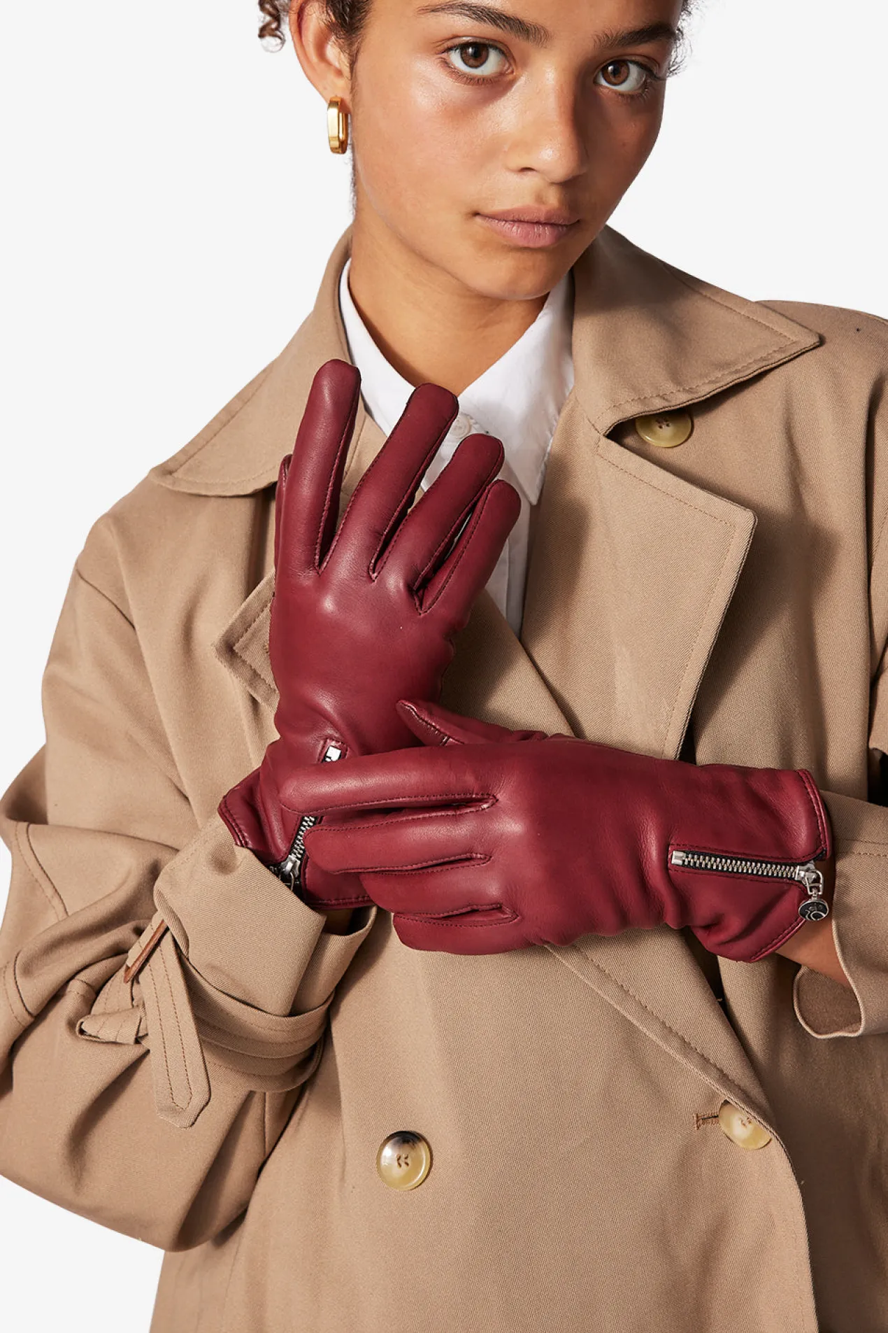 Adax glove Sanne. Nice plain glove in smooth leather with zipper detail on the upper side of the glove. Warm lining in 85% wool and 15% cashmere. There is a touch function in the index finger and thumb on both the right and left glove.
