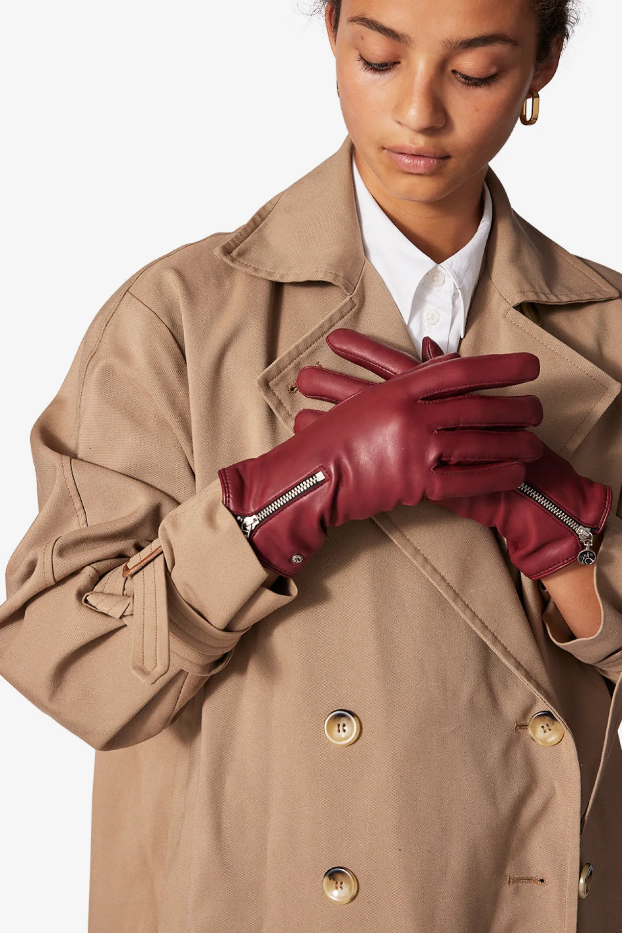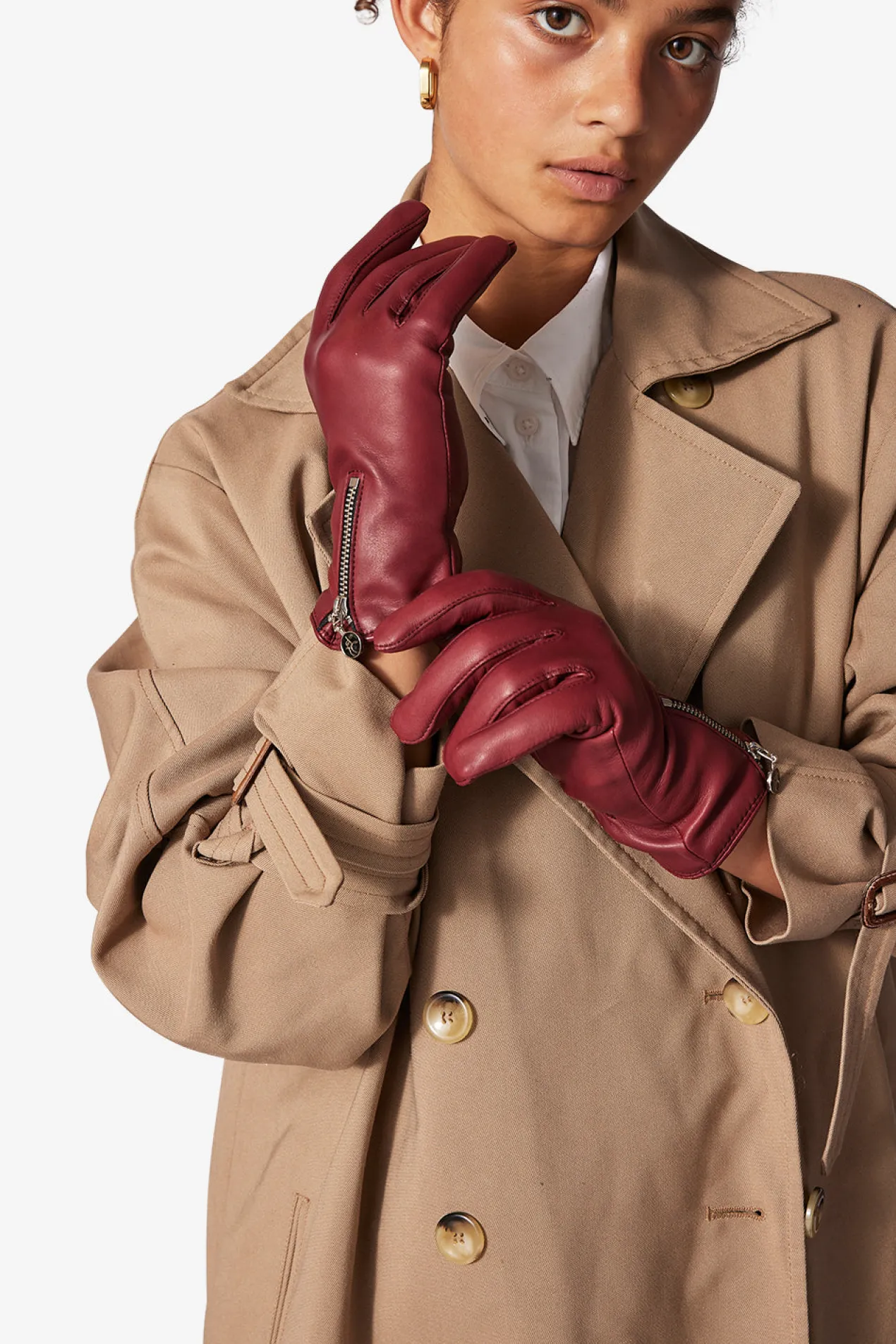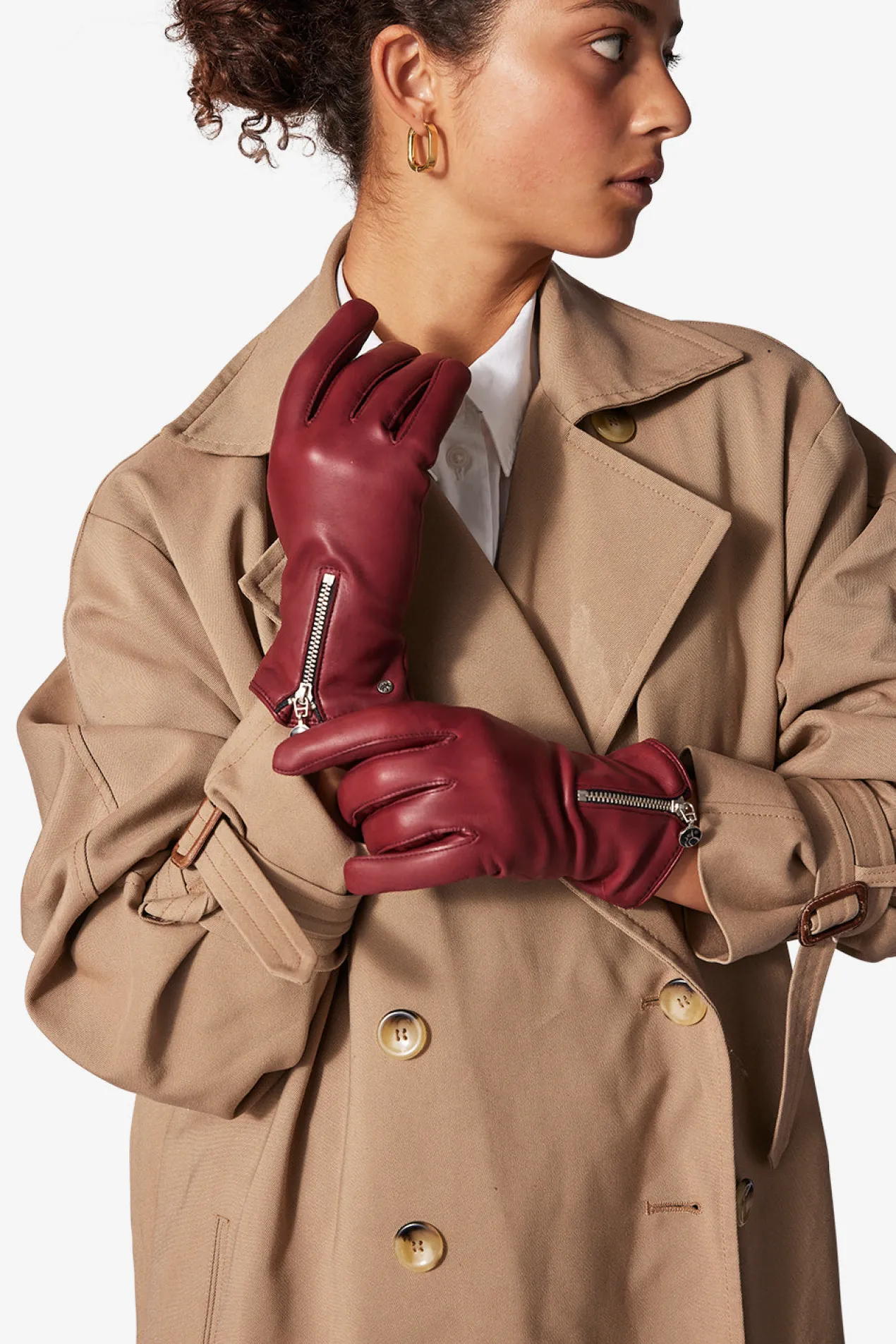 Adax glove Sanne. Nice plain glove in smooth leather with zipper detail on the upper side of the glove. Warm lining in 85% wool and 15% cashmere. There is a touch function in the index finger and thumb on both the right and left glove.