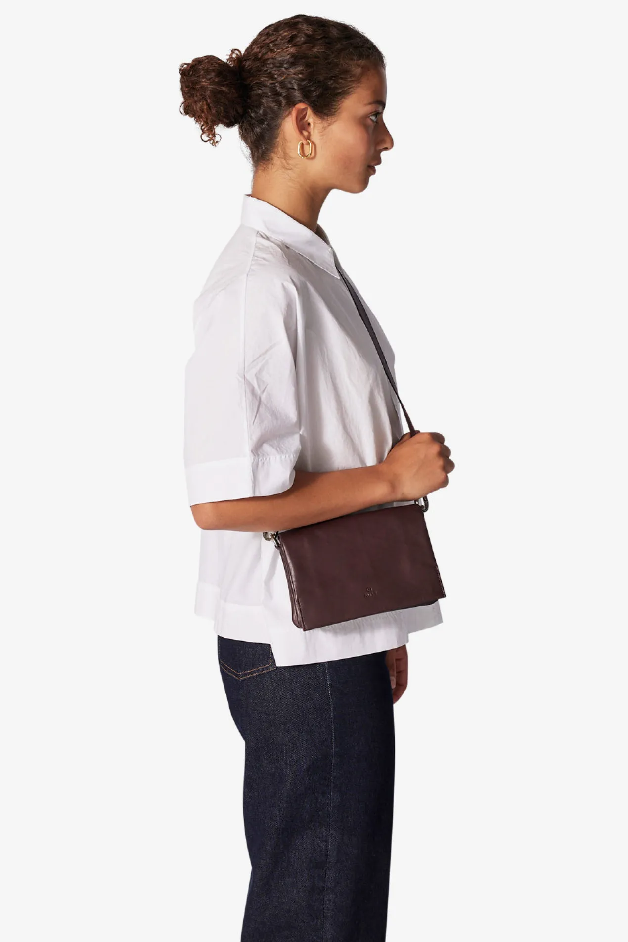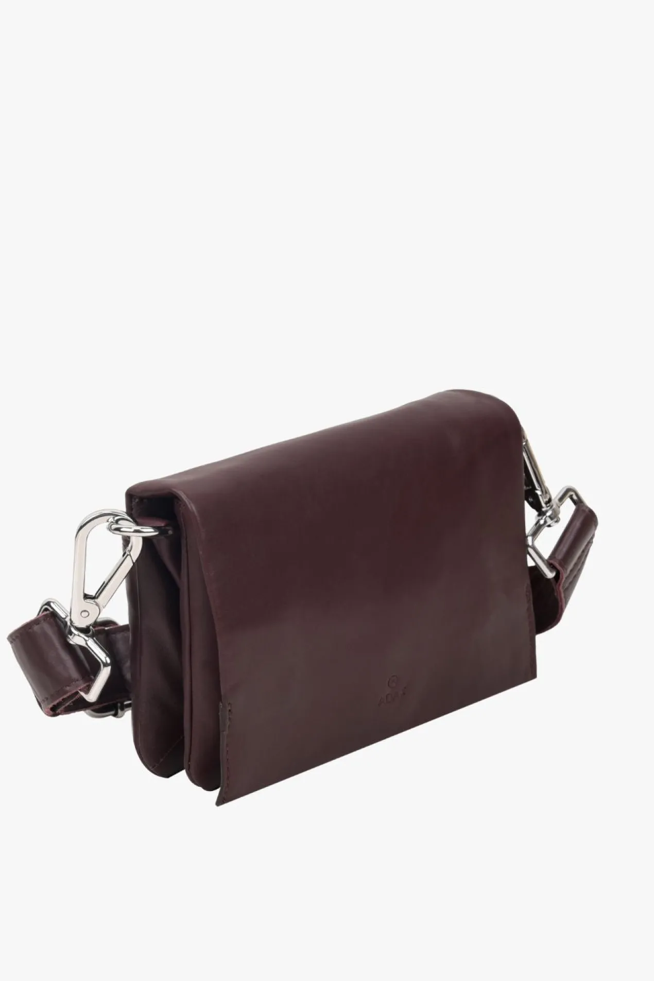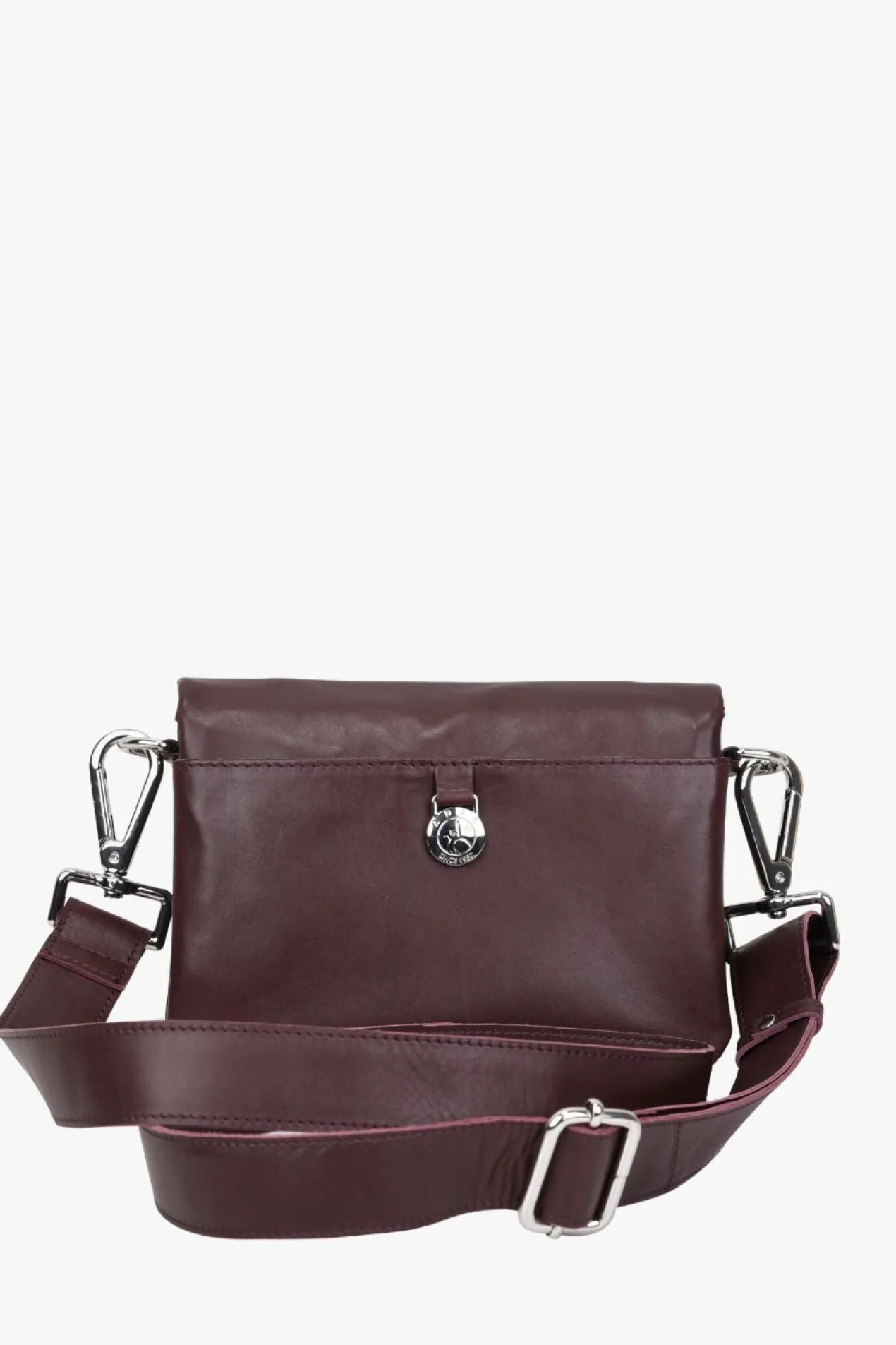 Franca is the perfect bag for everyday use.The inside space is divided into two compartments with a smaller flat zippered pocket placed in the lining of the one compartment.The bag I closed with a leather flap covering the full surface.On the backside the bag has a narrow compartment for e.g. the mobile phone or other things easy to grab on the go. This compartment closes with a magnetic button.The bag has a long and wide detachable leather strap which is adjustable in length for the perfect fit.