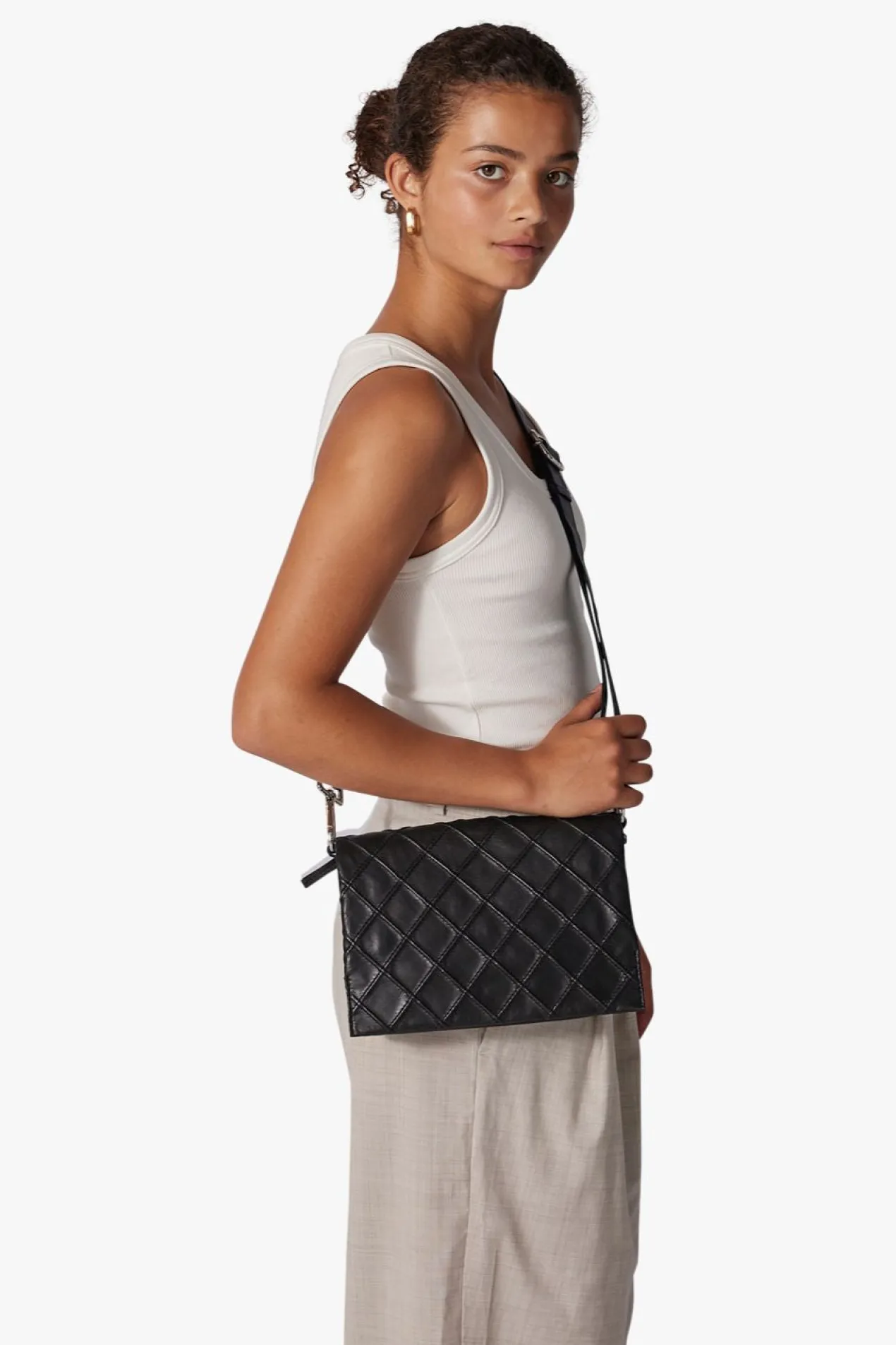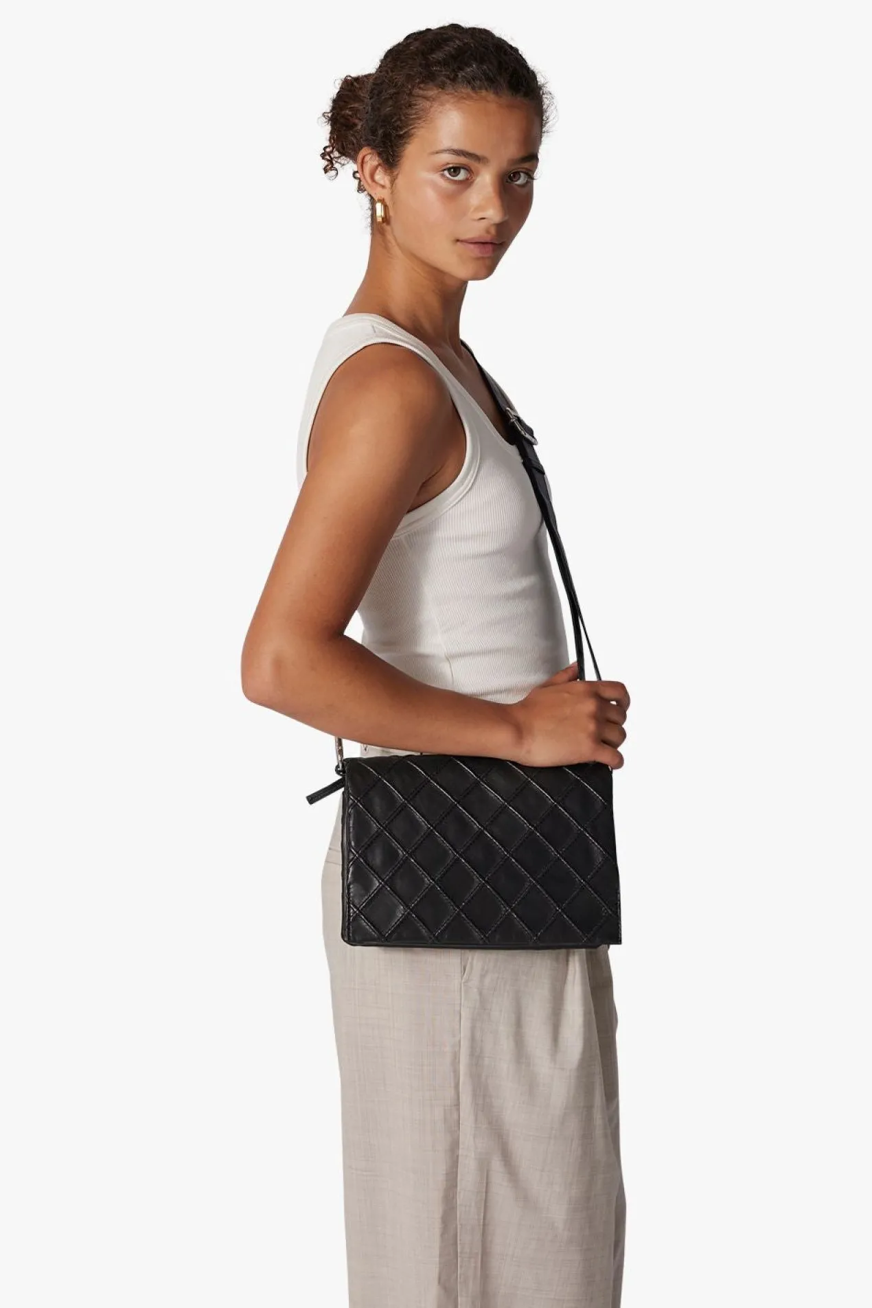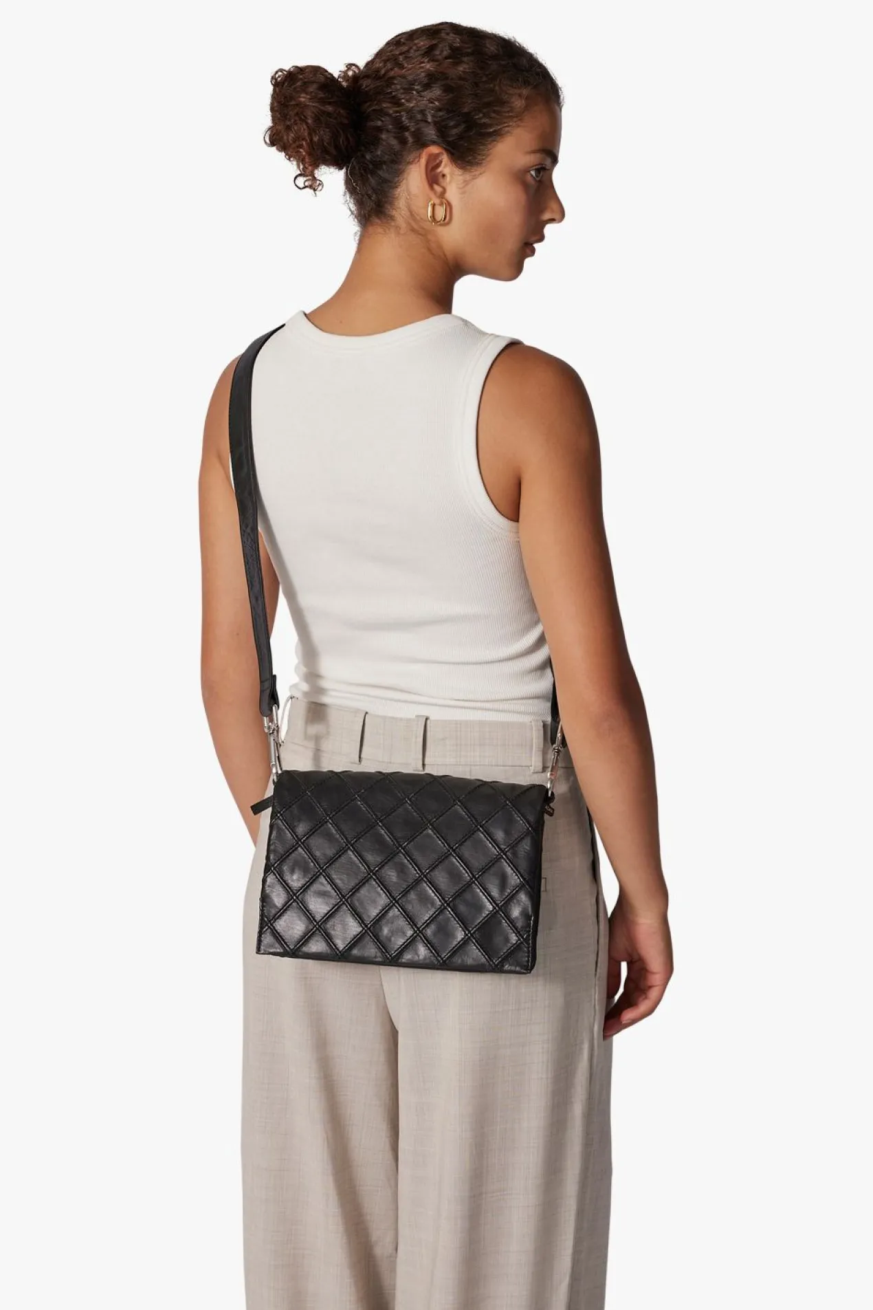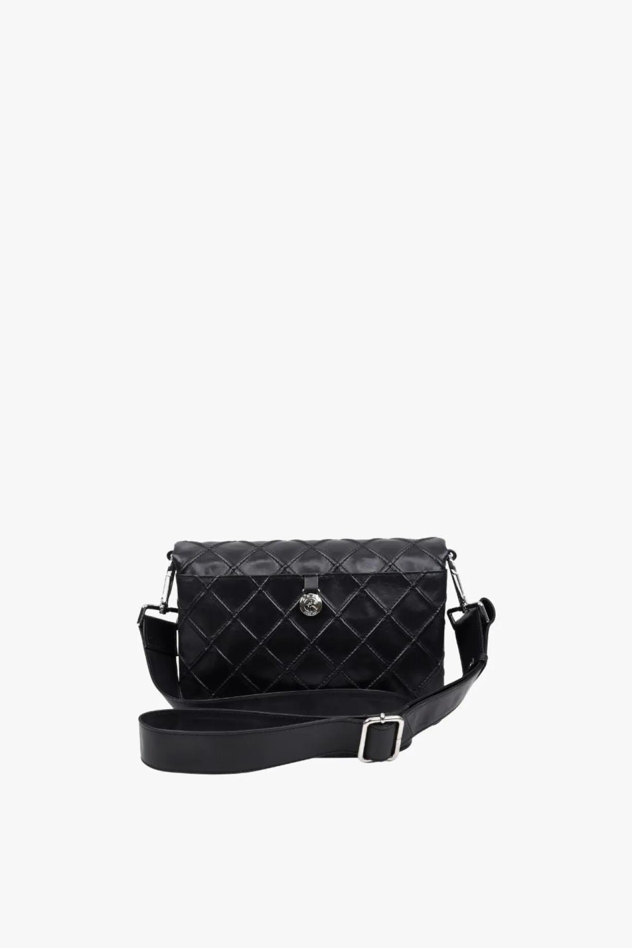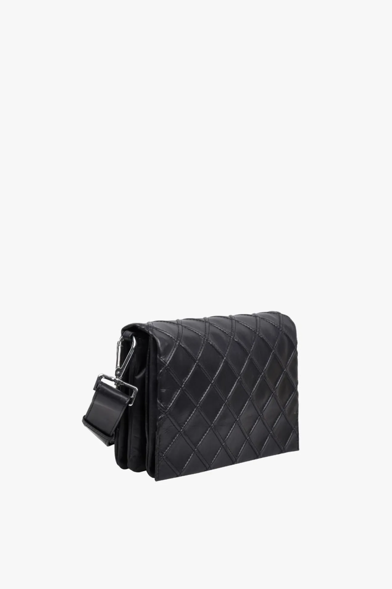 Hedwig shoulder bag in quilted Amalfi leather by Adax. Smart little shoulder bag in a very soft leather, which can be used as a crossover as the long strap is adjustable. The bag consists of 2 open compartments separated by a small zipper pocket, the bag closes with a flap with magnet closure. In one compartment there is a small zipper pocket and in the other an open leather pocket. There is also an open pocket on the back that closes with a hidden magnetic button. A small tote bag is included with the bag, as well as a warranty leaflet in the same quality and color as the bag. It can be used as a card holder.