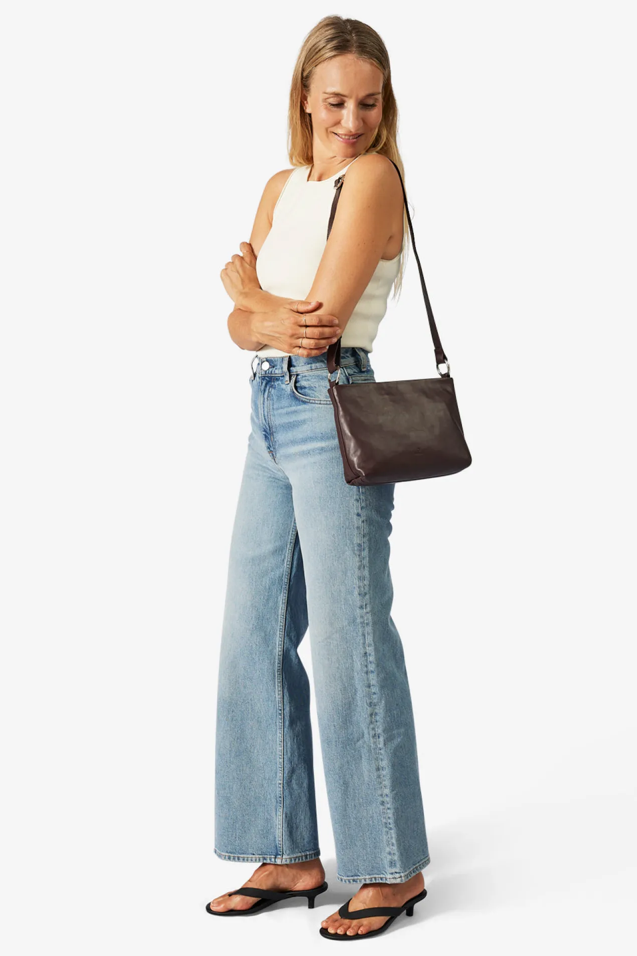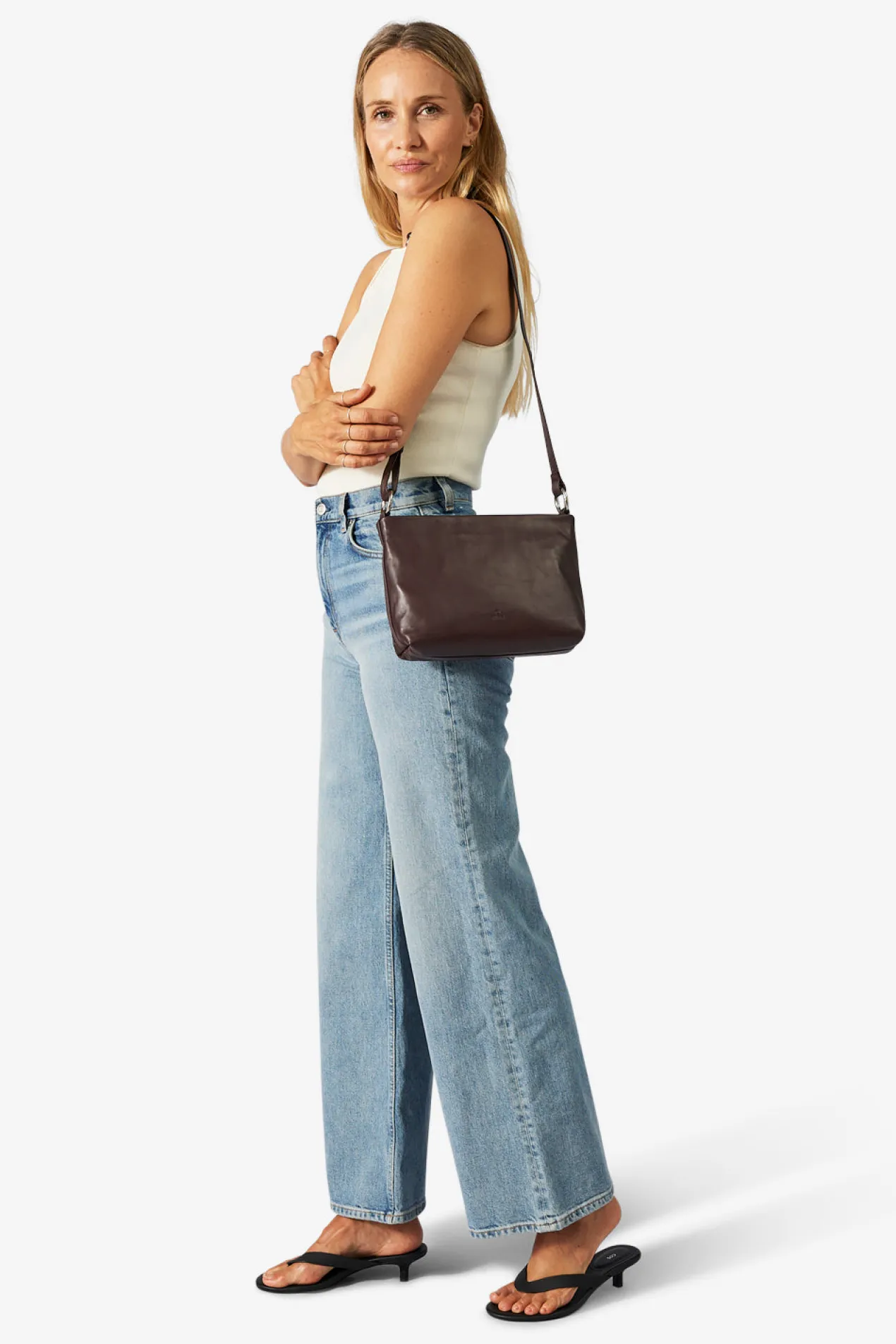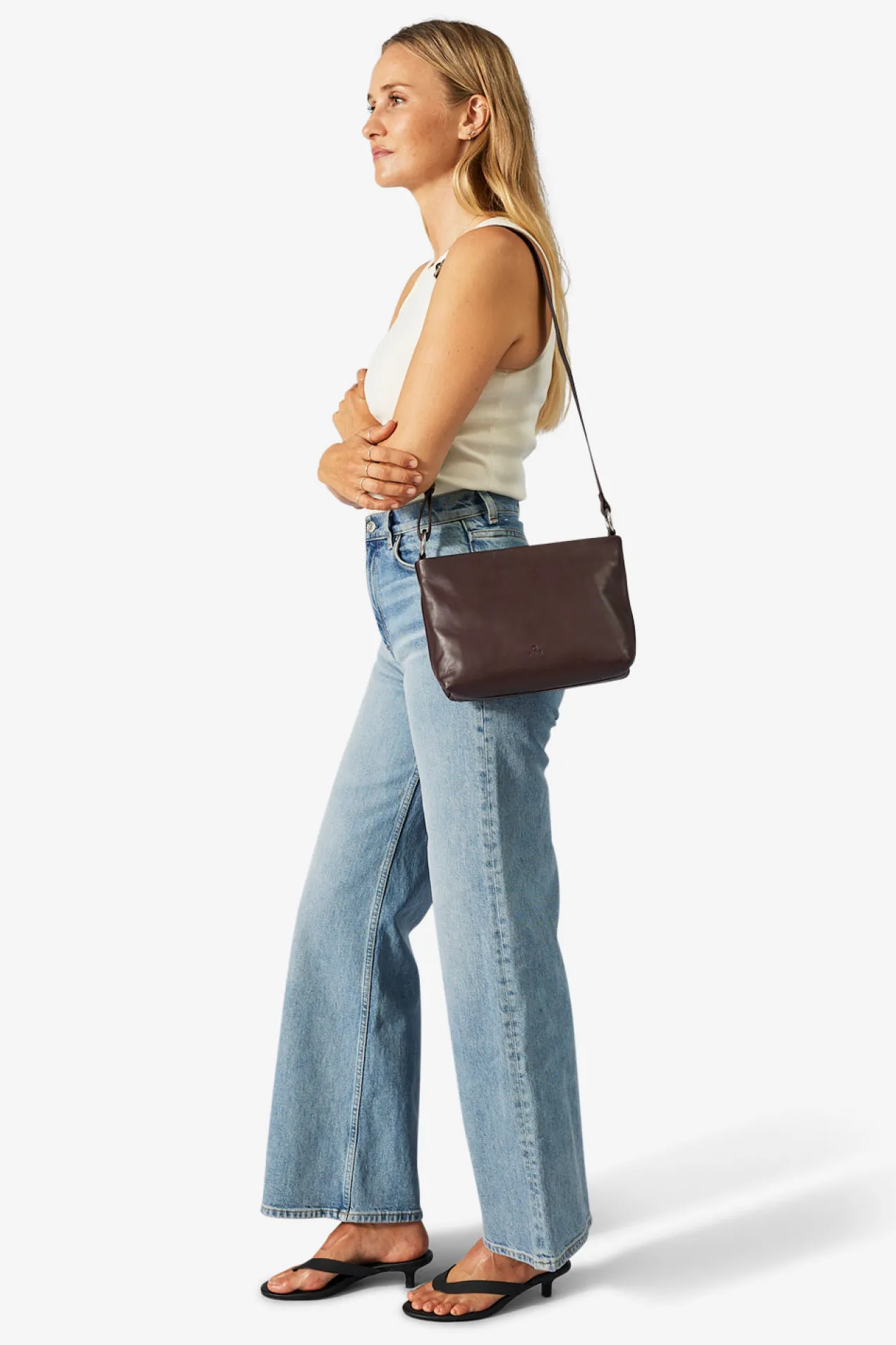 Klara shoulder bag in Amalfi leather from Adax. Klara comes with both a long adjustable strap and a short carrying handle. Both are removable, so you have the option to remove one of the straps. The bag closes at the top with a zipper closure. Inside there is one large compartment with an open leather pocket on one side and a small zipper pocket on the other. The bag comes with a tote bag and a small warranty leaflet that can be used as a card holder.