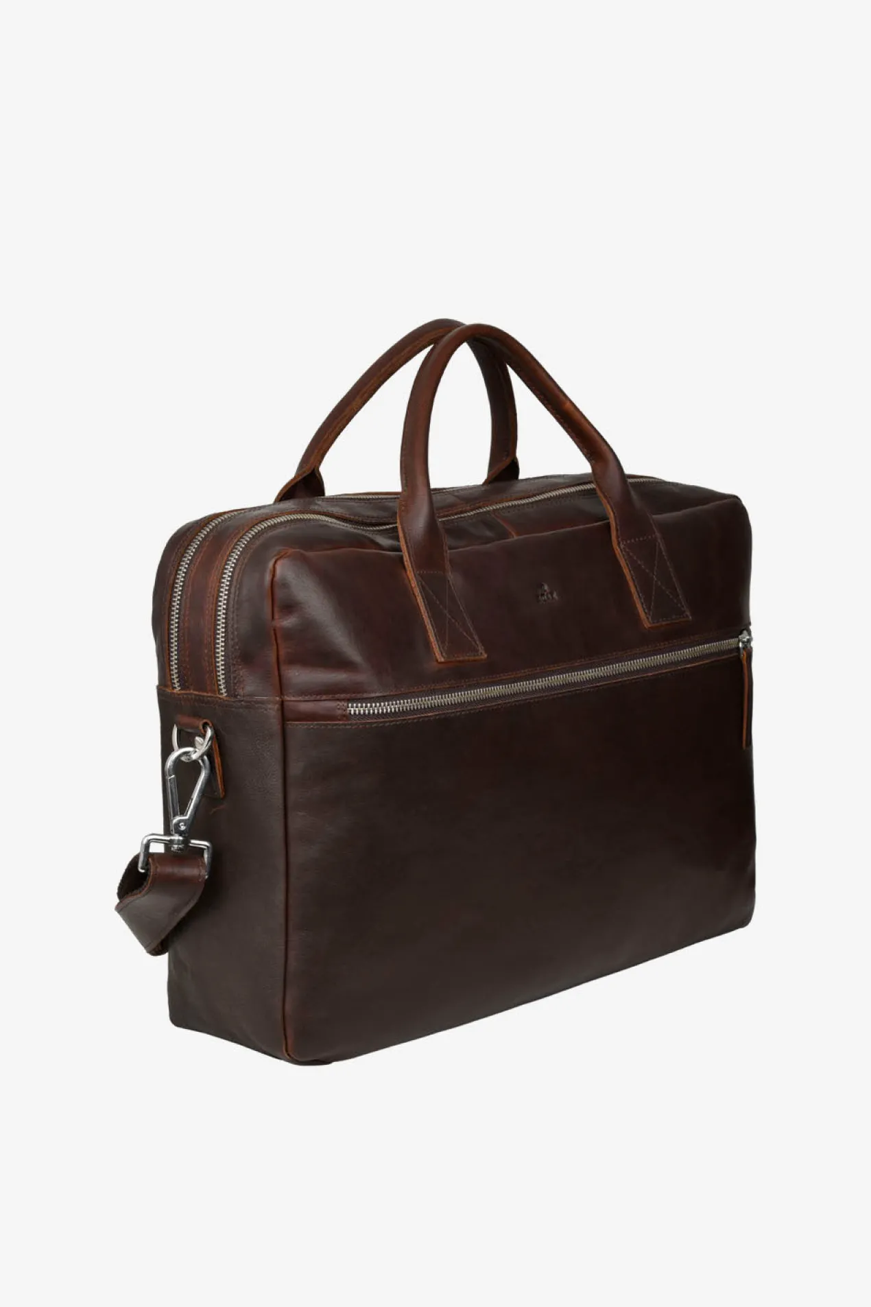 Axel is a great and simple briefcase in high quality leather, with enough room for what you may need to carry with you in your everyday life.The bag has two large compartments, which are both closed with a zipper. Axel can be carried in the two handles or in the detachable and adjustable shoulder strap. The outside features a zip pocket on the front, with great room for a wallet, keys etc.The inside features two large rooms; one with a pocket for a laptop with Velcro closure and one with a small zip pocket, two open pockets and two leather penholders.