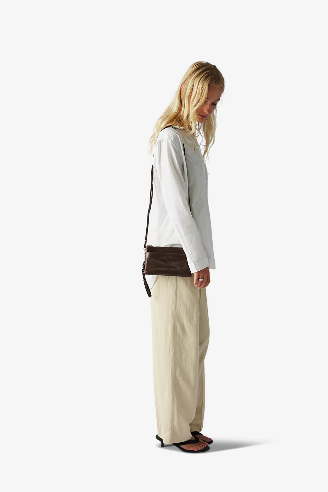 It has the same size as a clutch, but included is a slim adjustable shoulder strap which can be removed. There is a small braided wrist strap which can also be removed. Zip pocket on the front of the bag and zip closure at the top. All zippers and fittings are silver-plated. This clutch can contain six cards, and there are two slim zip pockets and an open leather pocket.